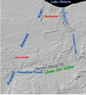In the lower part of the river, before entering Lake Ontario, the river appears to have been diverted once again from its ancient valley by the glacier. The original valley is thought to be that of Irondequoit Creek and Bay. The second image shows the most likely (buried) westward path originally followed by the river. With this blocked, the river cut a new channel, and created three waterfalls where it crossed limestone escarpments.
