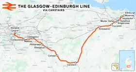 The Glasgow–Edinburgh via Carstairs line is a main railway route which connects the Scottish cities of Glasgow and Edinburgh, by means of their respective sections of the West Coast Main Line (WCML).