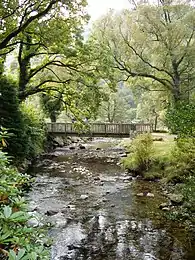 The valley of Glendalough was formed during the last ice age by a glacier which left a moraine across the valley mouth. The Poulanass River, which plunges into the valley from the south, via the Poulanass Waterfall, created a delta, which eventually divided the original lake in two.[15] Surrounding Glendalough are the mountains of Camaderry 699 metres (2,293 ft), the hydroelectric station at Turlough Hill 681 metres (2,234 ft), and large massif of Conavalla 734 metres (2,408 ft) which dominates the head of the valley, and the peaks of Lugduff 652 metres (2,139 ft), and Mullacor 661 metres (2,169 ft).[16][17]