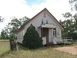 Glenmorgan Community Church is on the north-western corner of Clive Street and Sybil Street (27°14′53″S 149°40′30″E / 27.2480°S 149.6750°E).[13] It contains a stained glass window as a memorial to Mabel Killen, the founding President of the Glenmorgan Presbyterian Women's Guild.[25] The Meandarra/Glenmorgan Luthern congregation holds their services in the church.[26]