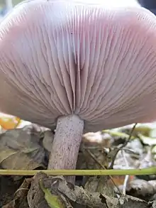- Adhering; attached to the stipe throughout its width, esp. of lamellae or tubes. Compare with free.[10]
