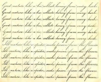 The "copybook headings" to which the title refers were proverbs or maxims, often drawn from sermons and scripture extolling virtue and wisdom, that were printed at the top of the pages of copybooks, special notebooks used by 19th-century British schoolchildren. The students had to copy the maxims repeatedly, by hand, down the page. The exercise was thought to serve simultaneously as a form of moral education and penmanship practice.