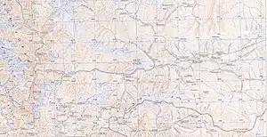 The Chang Chenmo ("Great Northern") Valley lies in a depression between the Karakoram Range in the north and the Chang Chenmo Range in the south.[9][lower-alpha 3] The Changchenmo river flows through the depression, originating near Lanak La and joining the Shyok River in the west.