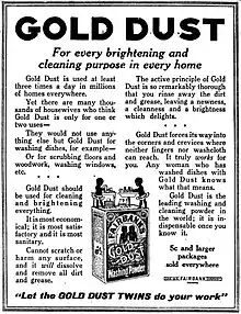 By 1892, the product's advertising and attention-grabbing packaging—black and white graphics on a bright orange background—became more focused on the iconic Gold Dust Twins.[8][3] The Gold Dust Twin characters of Goldie and Dustie were the 'faces' of Gold Dust products through most of their production, becoming one of the earliest brand-driven trademarks in American advertising.[3] They were often comically depicted, along with a huge stack of dishes in a washtub, with one twin cleaning, the other drying.[8] The Gold Dust Twins Radio Show—first broadcast in 1929 and created around the twins (and sponsored jointly by Gold Dust and Lever Brothers)—was one of the first of its kind in marketing history. The back of the box depicted the twins tackling several household chores and a list of jobs made easier by using Gold Dust washing powder.[4] "Let the Twins Do Your Work" was the product's slogan.[4]
