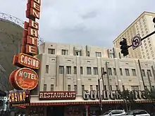 The hotel's casino operated until 1909, when gambling was banned in Nevada. The casino's blackjack and poker tables were subsequently put into storage.[4] By March 1918, Miller was considering a large addition to the hotel that would consist of reinforced concrete and would include 40 feet of frontage along Fremont Street.[15] The hotel gained additional popularity beginning in 1925, when city officials had Fremont Street paved. In 1931, the property was expanded to three and four stories and in early 1932 was renamed Sal Sagev (Las Vegas spelled backwards), with a Hotel Sal Sagev neon sign added to the building.[4][11][1]