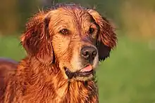 The Golden Retriever is still used as a gundog by sportsmen, both as a hunting companion in the field and for competing in field trials.[3][8][12] It is used more for retrieval of land-based gamebirds such as grouse and partridge than for wildfowl hunting.[8] Those used as gundogs are usually from working lines specifically bred for field use; dogs from pet or show lines are rarely suitable.[3][8][12] A Golden Retriever with a traditional dense double coat is well suited to working in cold and wet conditions, as the coat provides water resistance and insulation.[8][12] Compared to other retriever breeds, the Golden Retriever is not a strong swimmer; its long coat causes it to sit low in the water when swimming.[8]