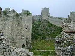 The first known record of Golubac is in Hungarian sources from 1335, when it was occupied by Hungarian military.[10][11] It was described as the "watcher made of stone, guarding the gorge".[9] Sometime between 1345 and 1355, Serbian Tsar Stefan Dušan toured the Braničevo region, which was part of Serbia along the boundary between Serbia and Hungary. He also visited Golubac, which was under the command of Castellan Toma, Voivode of Transylvania, under Hungarian control.[10] After Dušan's death, the House of Rastislalić gained influence in Braničevo, later winning independence. According to Serbian chroniclers, Knez (title) (Count) Lazar of Serbia evicted the last Rastislalić feudal lord, Radič Branković, in 1379, and then presented outlying villages to monasteries in Wallachia.[10]