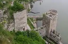 The Golubac Fortress (Serbian: Голубачки град or Golubački grad) was a medieval fortified town on the south side of the Danube River, 4 km (2.5 mi) downstream from the modern-day town of Golubac, Serbia. According to recent discoveries, the fortress, which was built during the 14th century by Medieval Serbian state, is split into three compounds which were built in stages.[2] It has ten towers, most of which started square, and several of which received many-sided reinforcements with the advent of firearms. Towers were not connected for easier defense. Serbian Medieval frescos were recently found inside the fortress.[2]