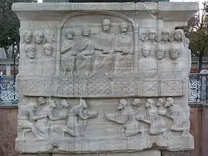 A relief on the Obelisk of Theodosius (389): on the upper tier, Honorius, Arcadius, Theodosius I, and Valentinian II, enthroned and flanked by court officials; on the lower tier, Persians (left) and Goths (right) presenting gifts in supplication[1][2][3]