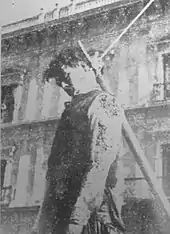 Once local press reported news of the attempt on the president's life, a crowd began to gather at the Plaza Murillo which soon swelled to some 80,000 people.[14] Eventually, rumors that the incident had been a conspiracy by the RADEPA and MNR to regain power caused the crowd to grow agitated leading to a mob forcing their way into the prison. Oblitas was dragged out of his cell and into the plaza where he was shot dead by Carlos Meyer before being hung on one of the lampposts in a manner similar to the fates suffered by Villarroel and others just months prior.[13] Unsatisfied, the mob then turned their attention to Captain José Escobar and Major Jorge Eguino who were also imprisoned in the panopticon awaiting trial for their role in the 1944 Chuspipata massacre during the Villarroel regime.[15][16] Eguino and Escobar, who at the time was with his six-year-old son, were beaten and dragged to the Plaza Murillo. Escobar, who at that point was already dead or dying, was the first of the two to be hanged. Eguino, however, first requested a Confessor, a Coca-Cola,[14] and time to make denunciations. The first two requests, but not the third, were granted and Eguino was then also hanged. However, when the rope was cut it was found that Eguino was still alive and he was instead shot twice before his corpse was re-hoisted onto another lamppost.[13]