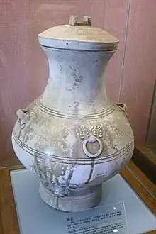 During the Han dynasty, the power a government official exercised was determined by his annual salary-rank, measured in grain units known as dan, shi or shih (, a unit of volume, approximately 35 litres (0.99 US bsh)). However, approximately half an official's salary in grain was made in payments of cash coins,[1] the standard of which, after 119 BC, was the wushu (五銖) coin measuring 3.2 g (0.11 oz).[2] The other half of an official's salary consisted of unhusked grain and husked grain measured in hu (觳, approximately 20 L / 676 oz); since one hu of unhusked grain was equal to 100 coins and one hu of husked grain was equal to 160 coins, the conversion ratio for unhusked grain to husked grain was 10 to 6 (see table below).[3] The most senior officials in central government earned a 10,000-dan salary. The officials who oversaw nine specialized ministries each earned the Fully 2,000-dan rank, while the magistrate of a county earned a 600-dan rank.[4] Occasionally, emperors bestowed luxurious gifts of wine, foodstuffs, and silk clothes upon high officials. These gifts, in some generous cases, could equal as much as half the value of the officials' standard annual salary.[5] Aged officials were often retired from service and given a pension.[6] Below is a table outlining salaries measured in coin cash, unhusked grain, and husked grain for the highest to lowest-paid officials in Han officialdom:[7]