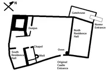 During the 14th century the castle expanded as the fortunes of the family grew. The northern residence block was extended and dominated the entire northern side of the castle. The castle gate was relocated to the northern corner. The steep cliff face on the northeast limited the size of the gatehouse. The large circular oven was added to the western side of the courtyard at about the same time.[2]