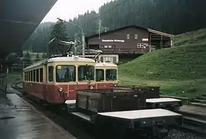 The BLM commences from Lauterbrunnen, using a terminus that is directly opposite the platforms of the Berner Oberland-Bahn (BOB) to Interlaken, and the Wengernalpbahn (WAB) to Kleine Scheidegg and Grindelwald. The first section of the line is an aerial cableway that rises 690 m (2,263.8 ft) in a distance of 1.4 km (0.9 mi). The cableway follows the line of the funicular that preceded it, and the remains of the funicular are visible at many points.[2][8]