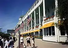Mackinac Island National Park became the second National Park in the United States in 1875 (before becoming a Michigan State park in 1895). This led to a large increase in visitors to the island.[8] In 1886, the Michigan Central Railroad, Grand Rapids and Indiana Railroad, and Detroit and Cleveland Steamship Navigation Company formed the Mackinac Island Hotel Company. The group purchased the land on which the hotel was built and construction began, based upon the design by Detroit architects Mason and Rice. When it opened the following year, the hotel was advertised to Chicago, Erie, Montreal and Detroit residents as a summer retreat for vacationers who arrived by lake steamer and by rail from across the continent. The hotel opened on July 10, 1887, after taking a mere 93 days to complete. At its opening, nightly rates at the hotel ranged from $3 to $5 a night (equivalent to $97.71–162.85 in 2022).[9][10]