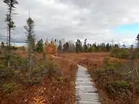 The park is divided into five parts, including two protected areas, the Old Forest and the Great Bog. La Forêt Sauvage and la Plaine are located in Villeroy and are used for nature observation and for snowmobile.[2] The total area occupied by the two main sectors, which are not connected, totals 30.97 square kilometres (11.96 sq mi), of which 20.67 square kilometres (7.98 sq mi) is occupied by peat bog and the rest by forest. The fifth part of the park is the Plessisville tourist office, the Carrefour de l'Érable, which has also served as an information center for the latter since 2012.[3]