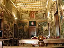 The Throne Room (Maltese: Is-Sala tat-Tron), originally known as the Grand Council Hall (Maltese: Is-Sala tal-Gran Kunsill, Italian: Sala del Maggior Consiglio) was built during the reign of Grandmaster Jean de la Cassière. It was used by successive Grandmasters to host ambassadors and visiting high ranking dignitaries. During the British administration it became known as the Hall of Saint Michael and Saint George after the Order of St Michael and St George which was founded in 1818 in Malta and the Ionian Islands.[20] It is currently used for state functions held by the President of Malta.