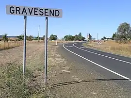 With closer settlement a village developed and was officially named Gravesend in 1909. In the 1930s, Gravesend was the site of a research station breeding cactoblastis moths later released to eradicate a devastating prickly pear infestation.[3] The surrounding area is given to agriculture production with sheep and cattle breeding, and the local wheat crops being taken a large silo complex being based in the village.