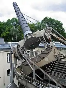 The Great telescope of the exhibition was noted as the most popular exhibit of the expo.[2] At the time the biggest telescope in Germany was an 18 inch aperture refractor, while the exhibit telescope had a 27 inch lens.[2] The tube is about 68 feet long (21 meters), the focal length of the lens.[2]