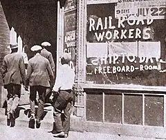Attempts by state and federal authorities to impose order proved to be an accelerant to the physical nature of the conflict. In the initial phase of the conflict, strikers attempted to set up pickets to close down railroad roundhouses and repair shops.[9] Private guards and law enforcement authorities were quick to remove strikers from private property, however, and with the strikebreakers frequently domiciled on the job site, new and more-violent tactics were used, including the issuance of physical threats, the vandalism of strikebreakers' homes, the destruction of railroad property, and instances of physical violence against strikebreakers.[9]