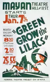 Green Grow the Lilacs is a play by Lynn Riggs.[1] It was performed 64 times on Broadway, opening at the Guild Theatre on January 26, 1931, and closing March 21, 1931. It had had an out-of-town tryout, running January 19–24, 1931, at the National Theatre in Washington, D.C. It is the basis of the 1943 musical Oklahoma!, which had a 1955 film adaptation.