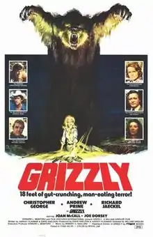 Grizzly (also known as Killer Grizzly on U.S. television) is a 1976 American horror thriller film directed by William Girdler, about a park ranger's attempts to halt the wild rampage of an 18 ft (5.5 m) tall, 2,000 lb (910 kg) Man-eating grizzly bear that terrorizes a National Forest, having developed a taste for human flesh. However, a drunken hunting party complicates matters. It stars Christopher George, Andrew Prine and Richard Jaeckel. Widely considered a Jaws rip-off, Grizzly used many of the same plot devices as its shark predecessor, which had been a huge box office success during the previous year. The giant grizzly bear in the film was portrayed by a Kodiak bear named Teddy, who was 11 ft (3.4 m) tall.