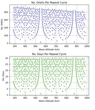These two effects must cancel out after a set orbital revolutions and (sidereal) days. Hence, equating the elapsed time to the orbital period of the satellite and combining the above two equations yields an equation which holds for any orbit that is a repeat orbit:
