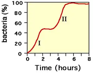 In this example (Figure 1, see Lac operon for details) the number of bacteria present in a nutrient-containing broth was measured during the course of an 8-hour cell growth experiment. The observed pattern of bacterial growth is bi-phasic because two different sugars were present, glucose and lactose. The bacteria prefer to consume glucose (Phase I) and only use the lactose (Phase II) after the glucose has been depleted. Analysis of the molecular basis for this bi-phasic growth curve led to the discovery of the basic mechanisms that control gene expression.