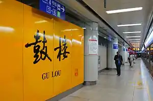 Gulou station (simplified Chinese: 鼓楼站; traditional Chinese: 鼓樓站; pinyin: Gǔlóu Zhàn; lit. 'drum tower station'), is an interchange station on Line 1 and Line 4 of the Nanjing Metro.[1] Opened on 3 September 2005 for the Line 1 portion of the station, Gulou station is among the first Nanjing Metro stations to open for passenger service.[2] The line 4 section of the station opened on 18 January 2017,[3] with cultural exhibits lining the station's walls.[4] Located underneath a roundabout that links to Beijing West Road, Beijing East Road, Zhongyang Road, Zhongshan Road and Zhongshan North Road, Gulou station is located near Gulou Hospital, Nanjing University's Gulou campus, and is right underneath the Zifeng Tower.