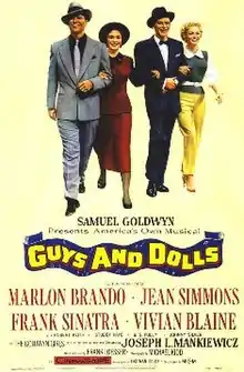 Guys and Dolls is a 1955 American musical film starring Marlon Brando, Jean Simmons, Frank Sinatra, and Vivian Blaine. The picture was made by Samuel Goldwyn Productions and distributed by Metro-Goldwyn-Mayer (MGM). It was directed by Joseph L. Mankiewicz, who also wrote the screenplay. The film is based on the 1950 Broadway musical by composer and lyricist Frank Loesser, with a book by Jo Swerling and Abe Burrows, which, in turn, was loosely based on "The Idyll of Miss Sarah Brown" (1933) and "Blood Pressure", two short stories by Damon Runyon.[2] Dances were choreographed by Michael Kidd, who had staged the dances for the Broadway production.