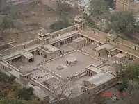 The present-day fort consists of a defensive structure and two main palaces, "Man Mandir" and Gujari Mahal, built by Tomar Rajput ruler Man Singh Tomar (reigned 1486–1516 CE), the latter one for his wife, Queen Mrignayani.[1] The second oldest record of "zero" in the world was found in a small temple (the stone inscription has the second oldest record of the numeric zero symbol having a place value as in the modern decimal notation), which is located on the way to the top. The inscription is around 1500 years old.[3][4]