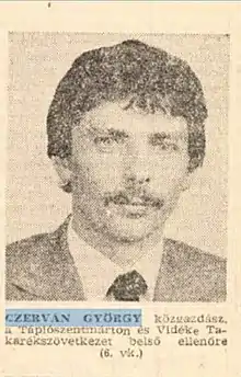 Czerván ran in the parliamentary elections of 1990 as a candidate of the Agrarian Alliance. In the summer of 1990 he founded the Tápiószentmárton branch of Fidesz, of which he was president until 1994. He was elected local representative in the October 1990 local elections, and was appointed Deputy Mayor of Tápiószentmárton.[1] He retained his positions in local government until 2002. In the parliamentary elections of May 1994 he was again unsuccessful.[2] He was, however, elected as a member of the Pest County General Assembly in the local elections in December, where he is active as deputy chairman of the Agricultural Committee.