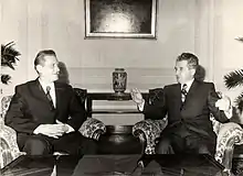 György Lázár signed a treaty in Budapest on 16 September 1977, which initiated the controversial large barrage project of Gabčíkovo–Nagymaros Dams. During his premiership, along with his deputies Antal Apró and György Aczél, he was a member of that delegation which took over the returned Holy Crown from U.S. Secretary of State Cyrus Vance in the Hungarian Parliament Building.[2] In the summer of 1987, when the highest party and state offices' major personnel changes were made (although most senior official only got another post, the same cadres stayed), Lázár was appointed Deputy Secretary-General of the Hungarian Socialist Workers' Party (i.e. deputy for Kádár). Károly Grósz succeeded him in the position of Prime Minister. The previous Deputy Secretary-General Károly Németh became Chairman of the Hungarian Presidential Council following the retiring Pál Losonczi.