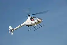 While working at Eurocopter on the Eurocopter AS365 Dauphin and Eurocopter EC120 Colibri helicopters during the 1980s, Bruno Guimbal decided to independently pursue the development of a two-seat reciprocating engine helicopter, which became the Guimbal Cabri G2.[1][2] This rotorcraft would incorporate numerous safety-related and general technological advances commonly applied to larger turbine-powered rotorcraft, but typically absent from reciprocating-engine helicopters.[3] These technologies included Eurocopter's Fenestron anti-torque shrouded tail rotor and Spheriflex main rotor, in addition to a composite fuselage.[4]