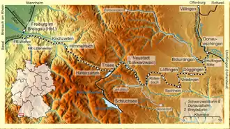 Further on, between Neustadt and Donaueschingen, the viaduct at the former Kappel Gutachbrücke station crosses the Wutach at the beginning of its long gorge. While in a 535-metre (1,755 ft) tunnel near Döggingen station, the line crosses a main European watershed, between the Rhine drainage basin (flowing into the North Sea) and the Danube drainage basin (flowing into the Black Sea).