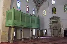 A Hünkâr Mahfili is a structure within the prayer hall of a mosque used for worship by the Sultan, the royal family, and high-ranking government officials. It originated in the Ottoman mosque of Turkey. Often raised, it provides privacy and protection from would-be assassins. It is often attached to a Hünkâr Kasrı.[1]