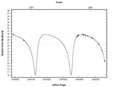 Radial velocity observations of HD 41742 A with the HARPS spectrograph detected variations on a level of several km/s over a period of months, indicating that the star is a single-lined spectroscopic binary (SB1).[16] Though an orbital fit was not attempted, A good orbital fit is possible (left), which implies that HD 41742 Ab has a minimum mass of ~0.2 M☉, and is on a high eccentricity ~222-day orbit around the 1.2 M☉ primary. Given that the lines of the secondary are not detected, it must have a significantly lower luminosity than the primary, indicating that it is of late spectral type.