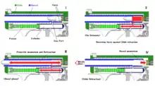 The P7 is a semi-automatic blowback-operated firearm. It features a unique gas-delayed blowback system modeled on the Swiss Pistole 47 W+F (Waffenfabrik Bern) prototype pistol[6] (and ultimately on the Barnitzke system first used in the Volkssturmgewehr 1-5),[7] which used gas pressures from the ignited cartridge and fed them through a small port in the barrel (in front of the chamber) to retard the rearward motion of the slide. This is accomplished by means of a piston contained inside a cylinder located under the barrel that opposes the rearward motion of the slide until the gas pressure has declined—after the bullet has left the barrel—hence allowing the slide to end its rearward motion, opening the breech and ejecting the empty cartridge case.[8]