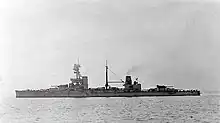 At 18:24, Agincourt opened fire on a German battlecruiser with her main guns. Shortly afterwards her six-inch guns followed suit as German destroyers made torpedo attacks on the British battleships to cover the turn to the south of the High Seas Fleet.[47] Agincourt successfully evaded two torpedoes, although another struck Marlborough.[48] Visibility cleared around 19:15, and she engaged a Kaiser-class battleship without result before it was lost in the smoke and haze.[49] Around 20:00, Marlborough was forced to reduce speed because of the strain on her bulkheads from her torpedo damage and her division mates conformed to her speed.[50] In the reduced visibility the division lost sight of the Grand Fleet during the night, passing the badly damaged battlecruiser SMS Seydlitz without opening fire.[51] Dawn found them with only the detritus from the previous day's battle in sight and the division arrived back at Scapa Flow on 2 June.[52] Agincourt fired 144 twelve-inch shells and 111 six-inch shells during the battle, although she is not known to have hit anything.[43]