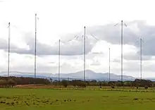 A large part of the site is taken up by the VLF transmitter's large trideco wire umbrella antenna.[4] This consists of a 748 feet (228 m) central mast with 6 vertical wire radiators suspended from its top fed at the base of the mast, attached to 6 rhombic-shaped 2148 ft long horizontal multiwire toploads which radiate from the central mast at angles of 60°, supported by 12 surrounding masts, giving the antenna the shape of a 6-pointed star when seen from above.[4] The cables supporting the endpoints of the wire antenna carry a load of 31 tons and are attached to computer controlled winches which automatically adjust the tension. The high voltage of several hundred kilovolts on the topload wires during transmission requires long strings of insulators where the wires are attached to the towers.