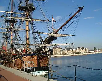 The Endeavour replica was assembled using traditional shipbuilding methods and materials where possible, although some changes were made to meet modern safety standards and enhance the longevity of the replica.[8][9] The vessel's hull is built from jarrah, with Oregon pine also used above the waterline: although oak and elm were used in the original ship, the decision was made not to use these as they were more susceptible to rotting.[7][9] Although some of the wood was fresh-cut, much of it was salvaged from demolished buildings and bridges, or taken from trees felled during construction work or storms.[5] The Endeavour replica is square-rigged with 25 sails made from "Duradon" (a brand of polyester rot- and water-resistant sailcloth), giving a sail area of between 1,461 and 1,511 square metres (15,730 and 16,260 sq ft), including 531 square metres (5,720 sq ft) of studding sails.[7][9][10] The ship is 43.6 metres (143 ft) long from bowsprit to stern, has a beam of 9.28 metres (30.4 ft), a draught of 3.4 metres (11 ft), and a mainmast height of 28 metres (92 ft).[10][11] Auxiliary propulsion is provided by two Caterpillar 3046 B diesel engines, which provide 404 horsepower (301 kW).[10] Most of the "20th century" equipment, including the diesel engines, a powered galley, and navigational equipment, is sited in what was the hold on the original Endeavour, keeping the upper decks in their 18th-century condition.[4]