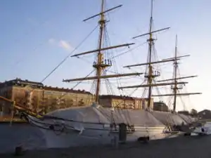 The three-masted, wooden hulled sailing ship was constructed at the Royal Naval Shipyard in Karlskrona in 1897 and served in the Swedish Navy as a sail training ship until 1938.[1]