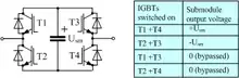 ![]() Operating principle of Modular Multi-Level Converter (MMC) for HVDC, with four series-connected submodules per valve. For clarity only one phase of the three is shown. |