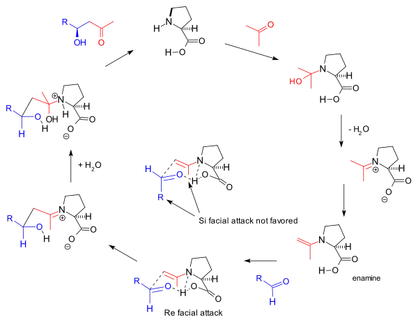 - ↑ Bahmanyar, S. (2001). "Transition States of Amine-Catalyzed Aldol Reactions Involving Enamine Intermediates: Theoretical Studies of Mechanism, Reactivity, and Stereoselectivity". Journal of the American Chemical Society. 123 (45): 11273–11283. doi:10.1021/ja011403h. PMID 11697970.