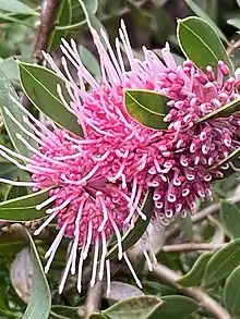 Hakea 'Burrendong Beauty' is a hybrid between H. myrtoides and H. petiolaris and was discovered in the Burrendong Arboretum.[1]