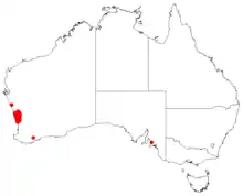 This hakea grows in mallee or open heath on deep sand, loam or clay from Geraldton and south to Moore River National Park.[2][3]