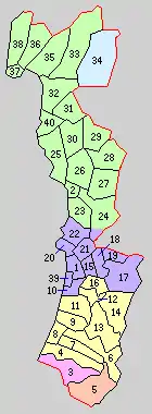 * yellow - areas formerly within the district borders during the early Meiji period