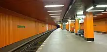 Halemweg is a station on the Berlin U-Bahn line U7, located in the Charlottenburg-Nord district. It was opened on 1 October 1980 (architect R.G.Rümmler) with the line's extension from Richard-Wagner-Platz to Rohrdamm. The eponymous neighborhood street is named after Resistance fighter Nikolaus von Halem, who was executed in Brandenburg-Görden Prison on 9 October 1944. The next station is Jakob-Kaiser-Platz.[1]