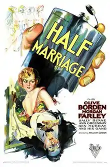Half Marriage is a 1929 American melodramatic pre-Code film directed by William J. Cohen from a script by Jane Murfin, based on the short story of the same name by George Kibbe Turner.[4] The film starred Olive Borden and Morgan Farley, while the later-famed gossip columnist, Hedda Hopper played Borden's mother.