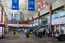 A new international arrivals area, three times larger than the previous one, opened at the north end of the terminal in August 2001. The upper level of this expansion included a space reserved for United States border preclearance facilities (see below).[35] A new domestic arrivals hall, accommodating three baggage reclaim belts and a Nova Scotia visitor's centre, officially opened on December 18, 2002.[36] Work also began in 2002 on a significant renovation to the central lobby of the terminal building. This expanded retail and dining space opened as the Airport Square on November 9, 2003. A third-storey public observation deck opened at the same time.[37] A southern terminal expansion was completed in 2005, expanding the departures holdroom, adding three new jet bridges, and creating a dedicated commuter aircraft facility with new ground-loading gates.[38]