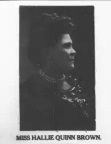 Hallie Quinn Brown (March 10, 1850 – September 16, 1950)[A] was an American educator, writer and activist.[1] Originally of Pittsburgh, Pennsylvania, she moved with her parents (who had been enslaved) while quite young to a farm near Chatham, Canada, in 1864 and then to Ohio in 1870. In 1868, she began a course of study in Wilberforce University, Ohio, from which she graduated in 1873 with the degree of Bachelor of Science.[2]